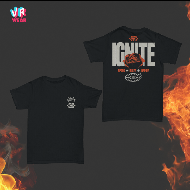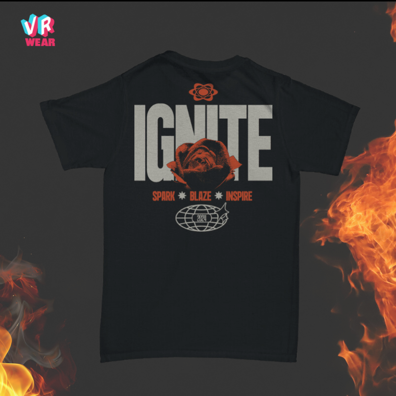 The VR WEAR Ignite Graphic Tee combines bold style with everyday comfort. Featuring a striking "IGNITE" design with a rose and atomic symbol, this tee is perfect for those who inspire and lead.