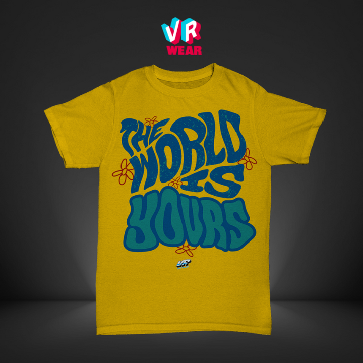 This vibrant and optimistic tee is a statement piece for those who believe in the power of positivity. Featuring a bold graphic with the empowering message "The World is Yours," this shirt is a reminder to chase your dreams and make your mark on the world. The design is printed on a high-quality, comfortable cotton blend, ensuring both style and comfort.